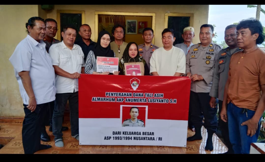 Santunan diserahkan langsung oleh perwakilan alumni ASP 93/94 saat mengunjungi kediaman istri almarhum di Kelurahan Pajaresuk, Pringsewu, Lampung, pada Rabu (9/4). Kegiatan ini merupakan bentuk silaturahmi sekaligus dukungan moril kepada keluarga yang ditinggalkan. AKP Lusianto gugur dalam tugas saat melakukan penggerebekan arena judi sabung ayam di Kabupaten Way Kanan.