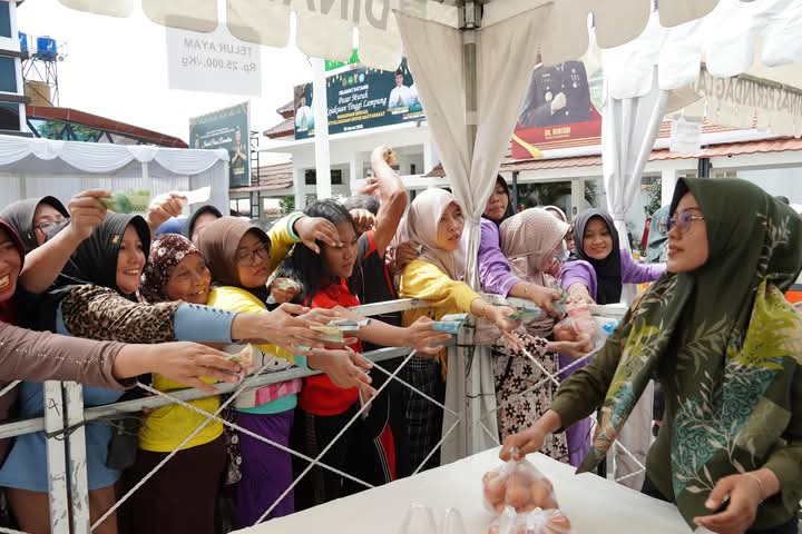 Setibanya di lokasi, Ketua TP. PKK Provinsi Lampung langsung meninjau stan pasar murah yang menjual berbagai barang kebutuhan pokok dengan harga yang terjangkau.