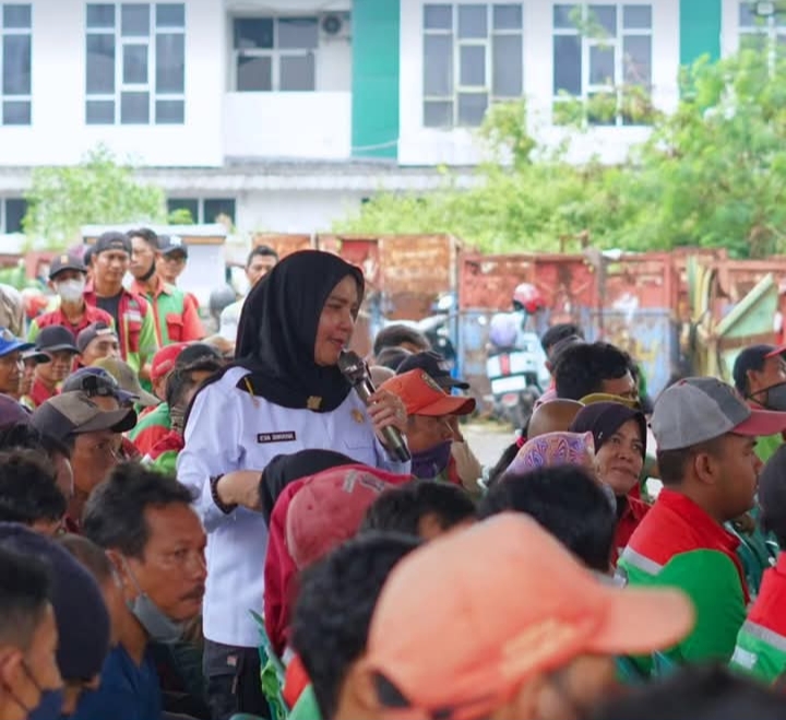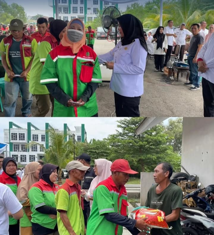 Sebanyak 800 petugas lingkungan hidup menerima paket sembako dan uang santunan yang diserahkan langsung oleh Walikota Hj. Eva Dwiana.